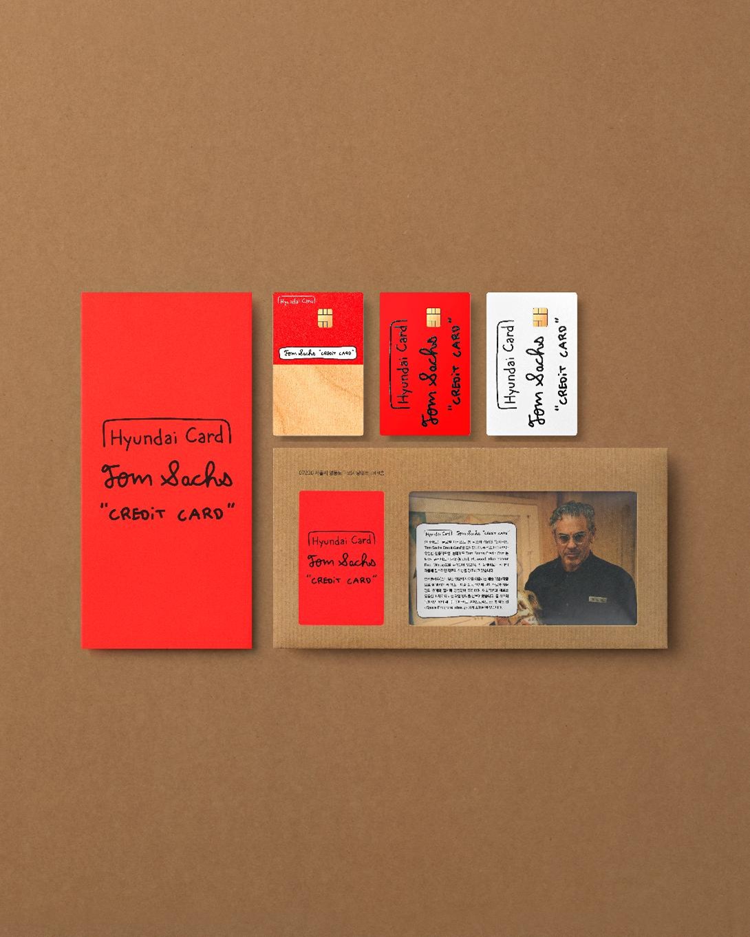현대카드는 톰 삭스와 함께 ‘현대카드 Tom Sachs “Credit Card"'를 공개했다. '현대카드 Tom Sachs “Credit Card"’는 총 4종으로 두랄루민과 브론즈로 만든 ‘Metal’, 합판의 나무 결을 섬세하게 살린 ‘Plywood’, 전면과 후면의 강렬한 대비가 돋보이는 ‘Fluorescent Red’, 톰 삭스의 핸드 라이팅으로 표현한 ‘White’로 구성됐다. 이 중 ‘Metal’은 톰 삭스가 디자인한 ‘핸드 크래프트 박스’ 카드 패키지에 제공된다. 이 패키지는 톰 삭스 특유의 작업 스타일인 ‘브리콜라주’ 기법이 반영돼 그의 예술 세계를 고스란히 경험할 수 있다.